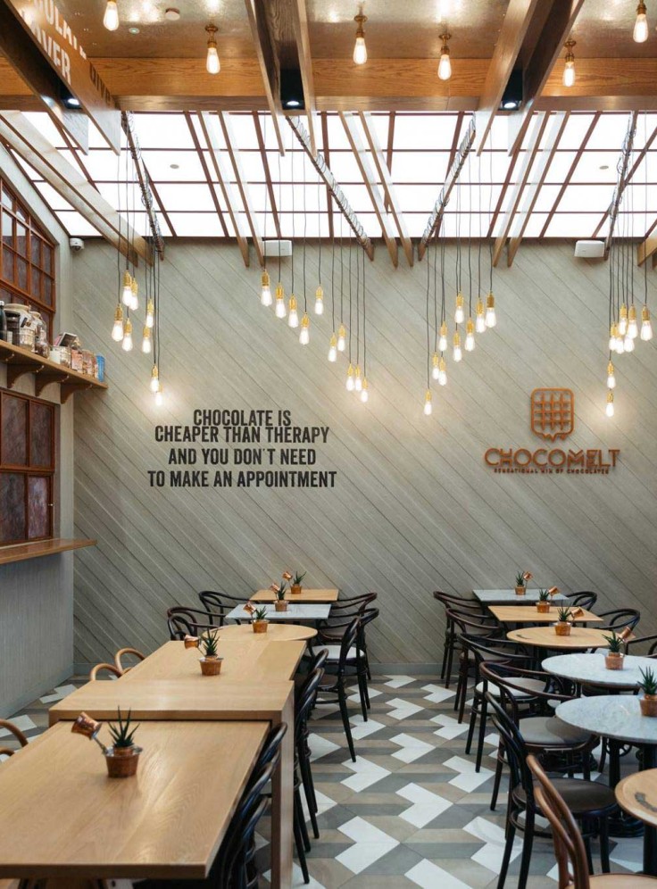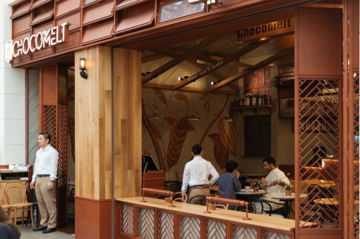 CHOCOMELT This Chocolate Dessert café, our first truly café project by p/s/d and it is our first project in Kuwait. For Chocomelt, this is the second branch located in The Avenue, the largest semi-outdoor Hi-end shopping mall in the country. It is interesting that the location of the shop is incredible, it can be seen outstandingly from the center lower floor which is clearly featured. The idea of designs was initially researching from the brand, itself, with three words valuable, craft and process. Chocomelt concerned high quality ingredients especially cacao beans, related to their unique and special menus. As a result, designers brought the source of business which is cacao beans. Starting with the sorting process in the high standard factory, the scenery was created as if customers are sitting in the factory watching their producing, such as the roof form and the natural light from the outside through the skylight void. Seating layout became another highlight for this shop, various yet united. Last but not least, the enormous front door of the factory was designed and inspired by cacao beans which mean, Chocomelt, the sensational mix of chocolates.