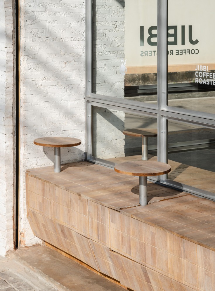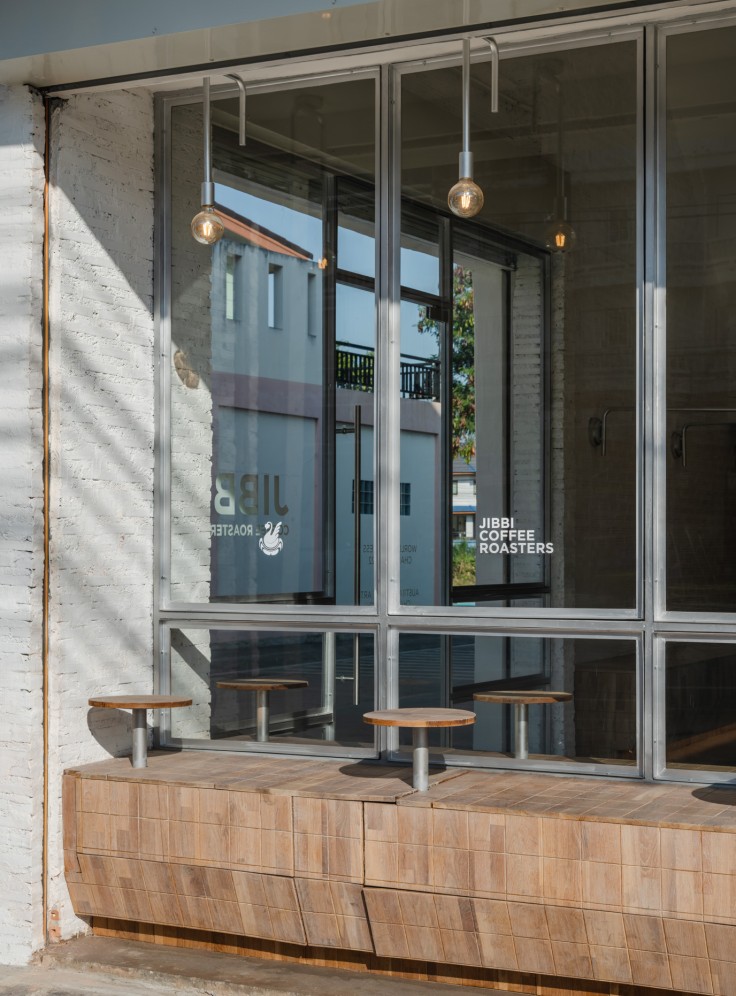 The exterior has been newly designed using steel frames as the main structure for doors and windows, combined with large glass panels to create a sense of openness and transparency. The interior is clearly visible even when passing by, enhancing the connection between inside and outside. Outdoor seating seamlessly connects to the indoor area, while seating near the coffee bar supports both a comfortable dine-in experience and a convenient Grab & Go zone. A key highlight of Jibbi Coffee Roasters is the side façade, where the wall features a Swan latte art pattern an iconic element and logo of the brand.