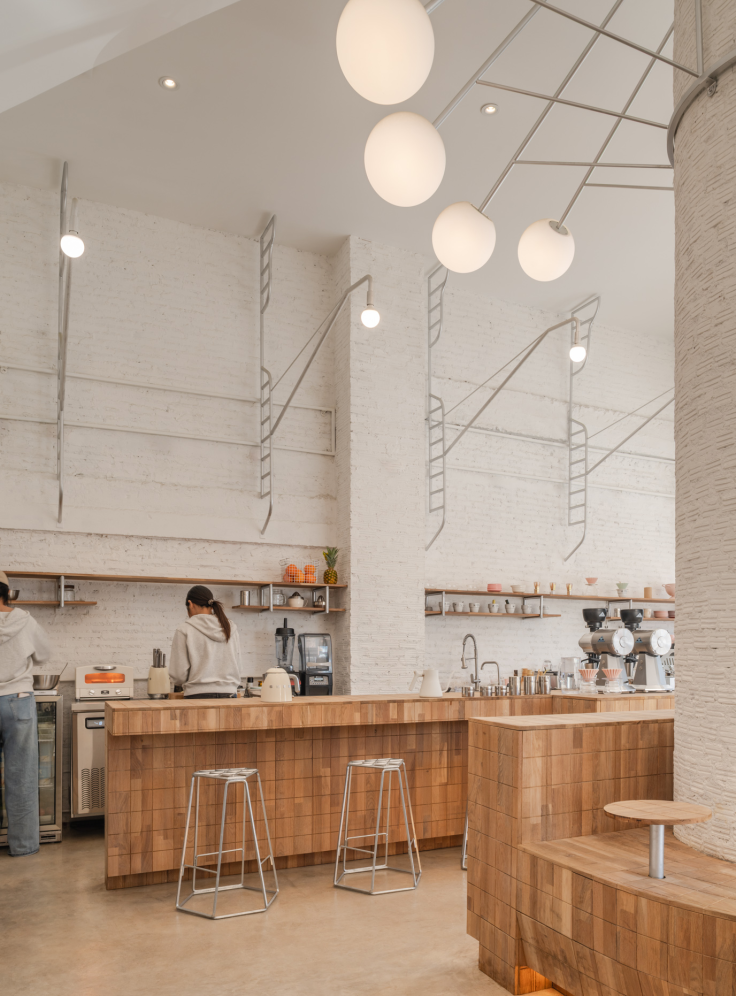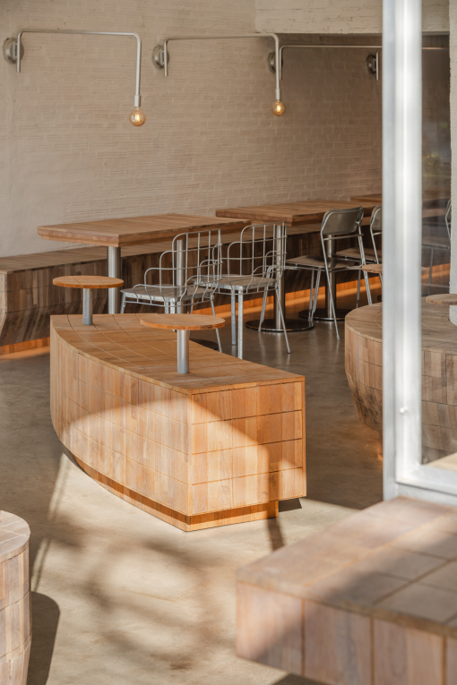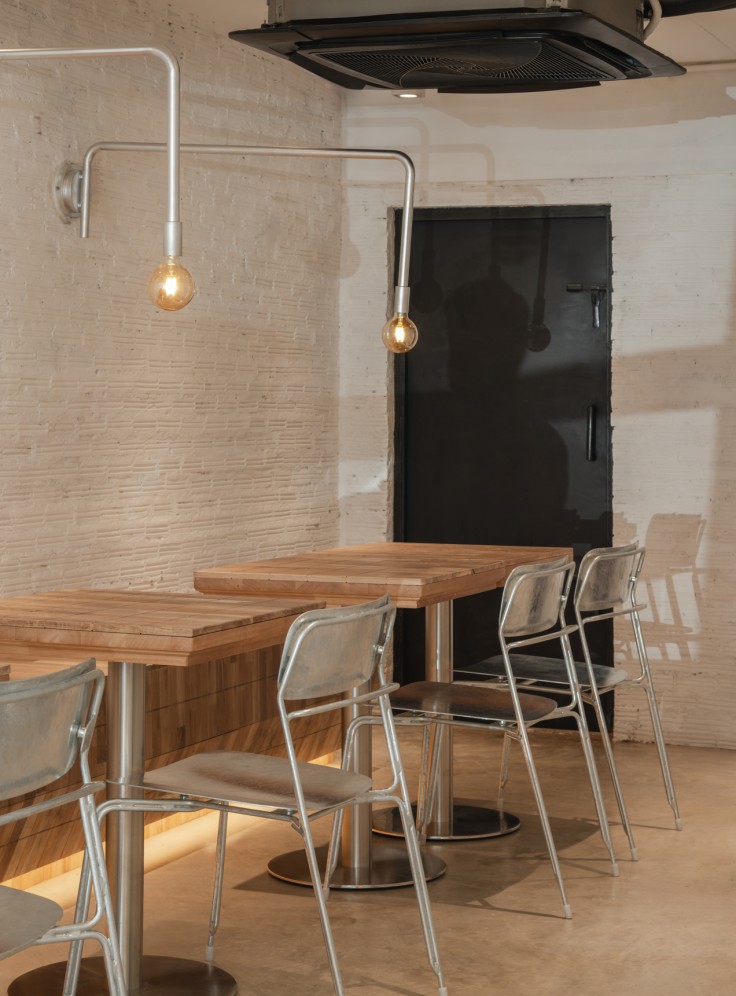 Inside, the café features a long coffee bar designed to accommodate both a Speed Bar and a Slow Bar, with customer seating integrated along the bar.The main interior design inspiration is derived from a grid system, reflected in the routed patterns on laminated plywood used for the bar and seating areas. Furniture is arranged as if sculptures displayed in a museum, allowing each piece to stand out individually. All columns, both inside and outside the café, are designed in a circular form to soften the spatial experience. At the center of the café, pendant lights are arranged around the column, inspired by the movement of the moon orbiting the Earth and the natural phenomena created by this motion. Seating throughout the space uses steel chairs from Galvanii, showcasing a raw matte aesthetic with a galvanized finish. The café harmoniously combines two primary materials, steel and wood balanced with a transparent glass façade that allows natural light to flood the interior. This creates a space that feels open, comfortable, and inviting, enhancing the overall dining experience.