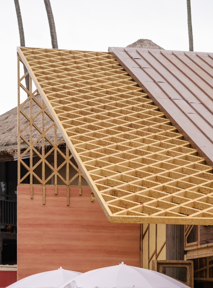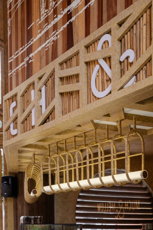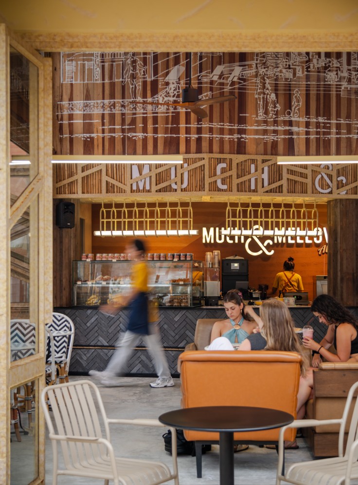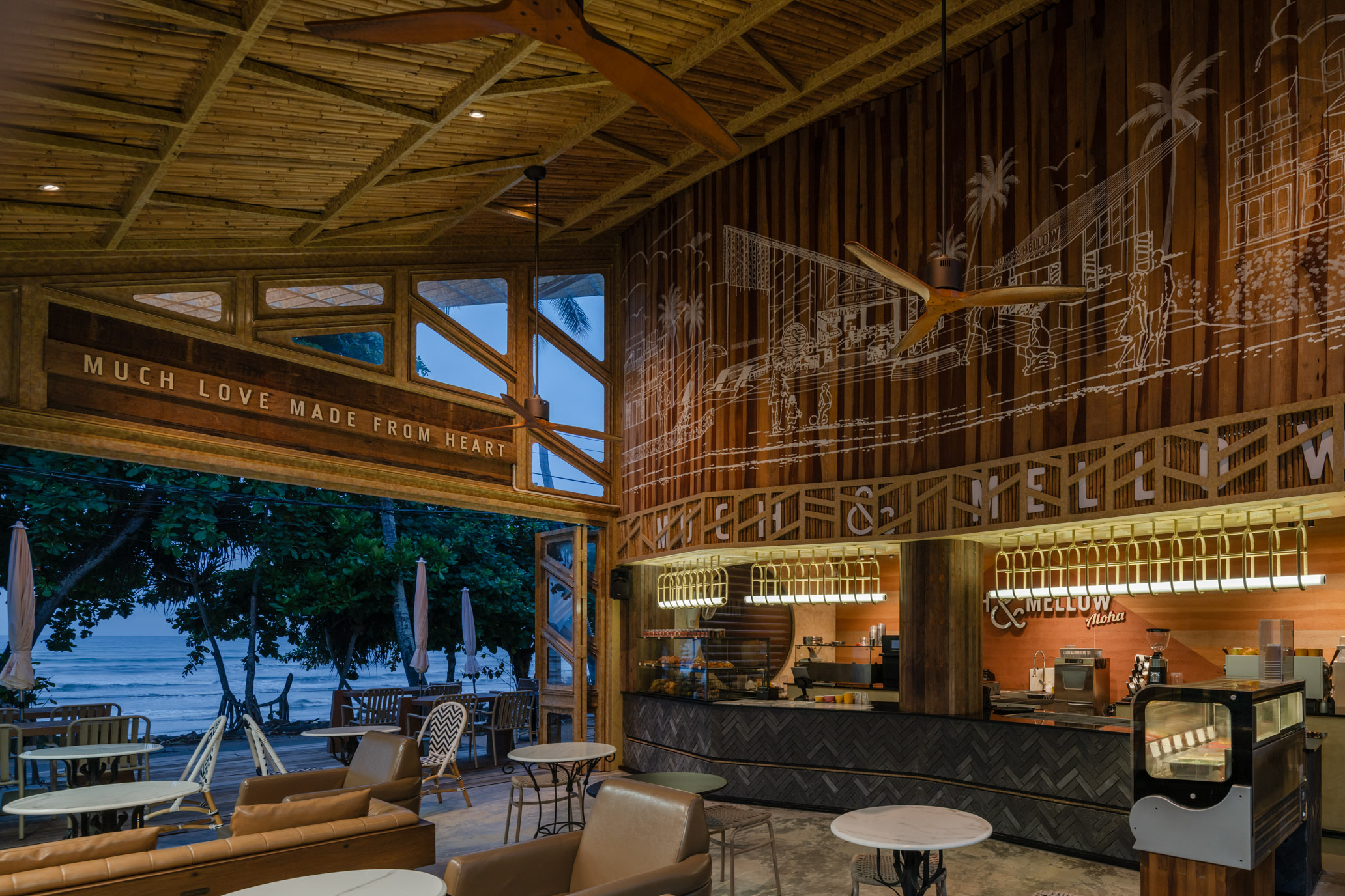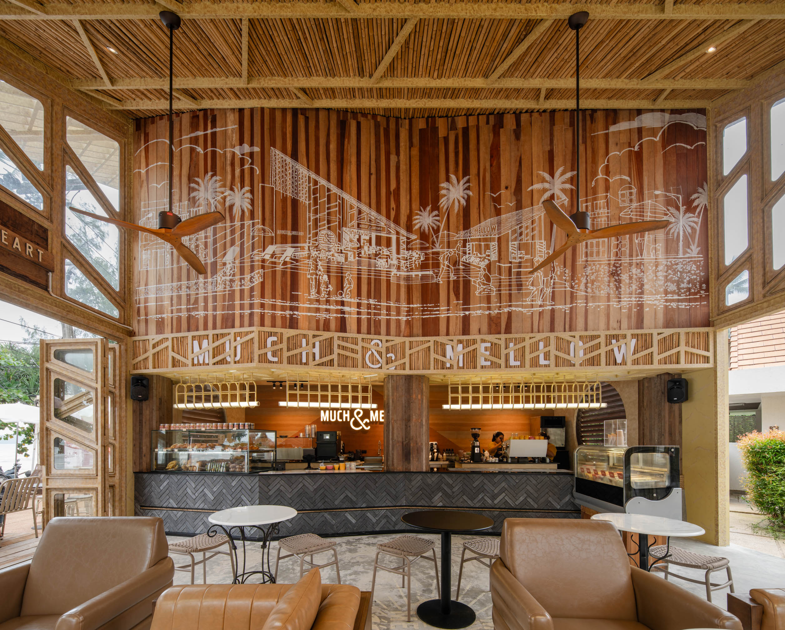 The design emphasizes natural materials such as compressed earth walls and exposed brick masonry, creating a warm connection between the space, its surroundings, and the people who pass through. The ceiling and facade integrate both bamboo and timber, exposing the structure and continuing the architectural language established in the original Much & Mellow.