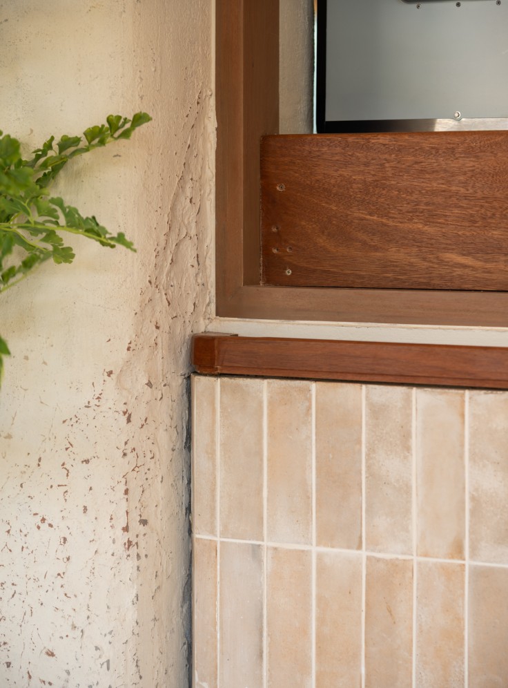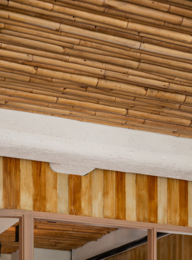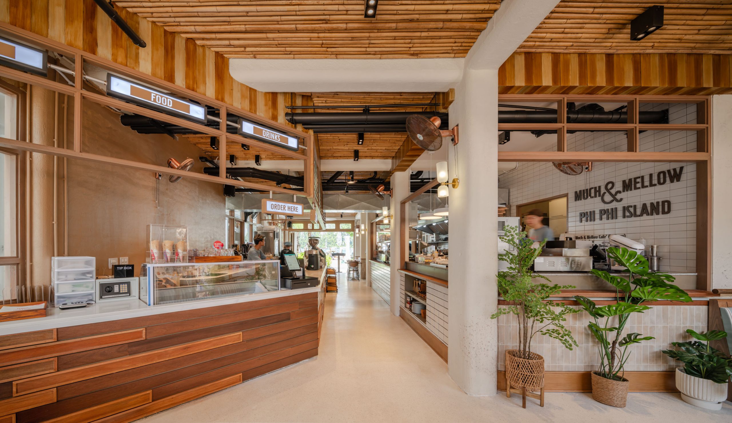 We use materials such as dried bamboo, rough brick walls, and other Raw Materials to create a link with Much & Mellow’s first and second branches. The branch has a total of 60 seats, divided into 60 for Indoor and Outdoor seating for customers and 40 for the store’s Station Prep. The design includes two entrances, allowing access directly to the beach at the back or a See through the sea view.