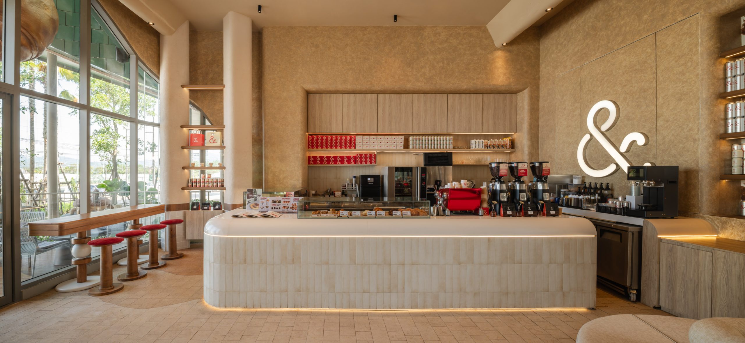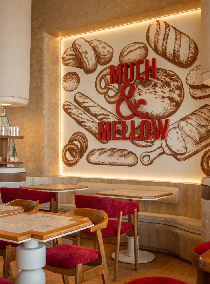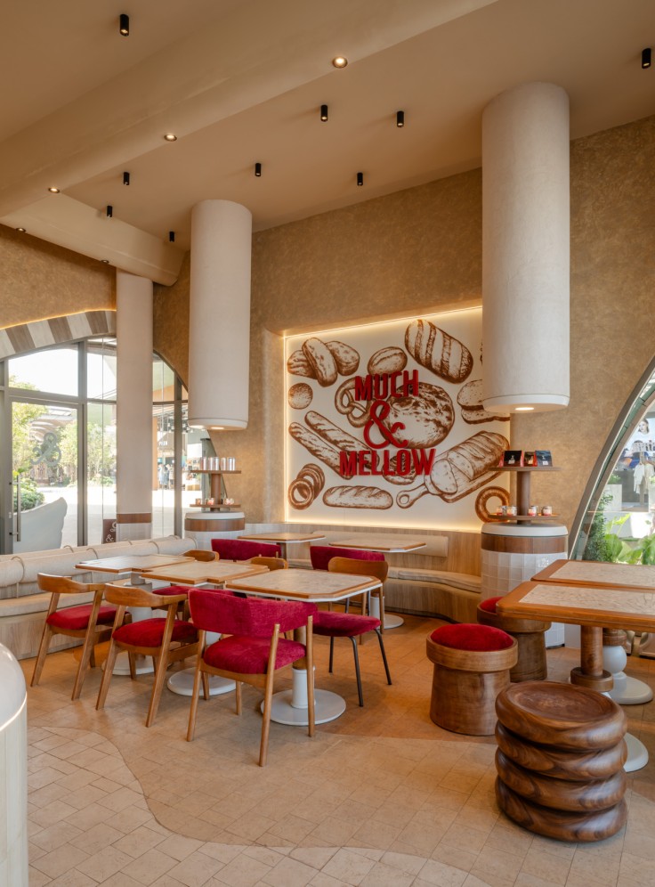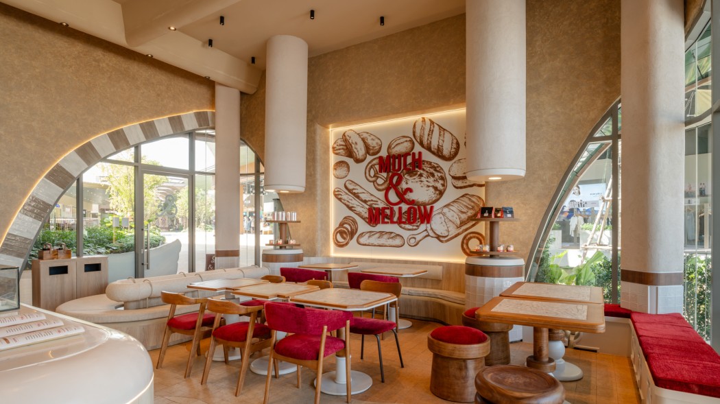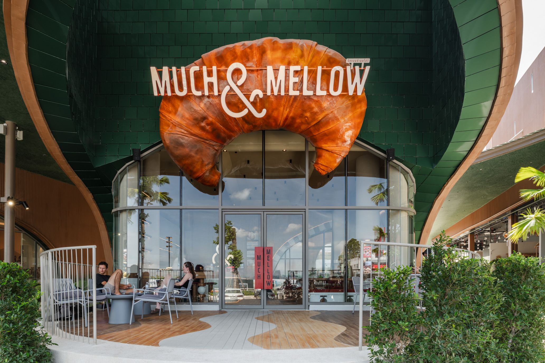 Much & Mellow at Central Krabi is the brand’s fifth branch and the first location situated within a shopping mall under the Central Group. Located at the front of Central Krabi, close to the main road, the storefront is designed with a simple and understated approach, placing emphasis on an oversized croissant as the main feature. This large croissant functions as an iconic signage element and serves as the central theme of the design concept for this branch. The iconic signage plays a key role in creating strong brand recognition and visual identity.