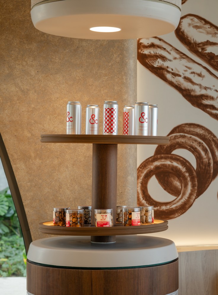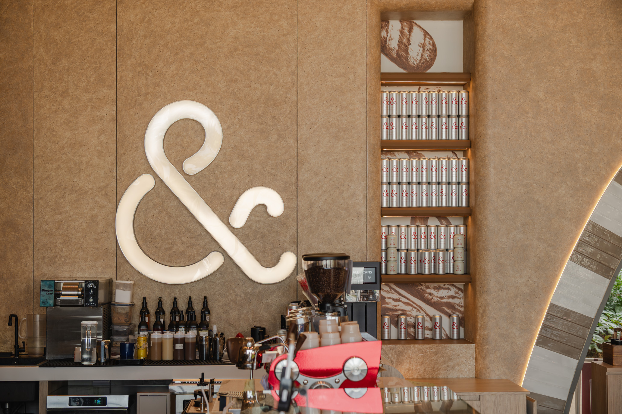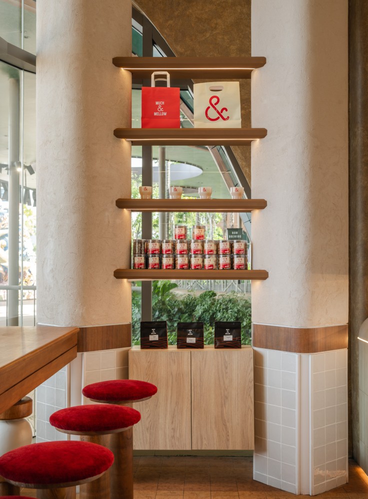 Inside the store, the overall design concept focuses on softness and rounded forms inspired by the shape of a croissant. This design language is consistently applied across various details throughout the space, resulting in a warm and welcoming atmosphere that avoids rigidity. The overall spatial concept highlights craftsmanship, particularly at the bar counter, where handmade tiles with rich colors and textures are used. Skilled craftsmanship is emphasized through the careful arrangement of tiles, ensuring a balanced and visually pleasing composition.