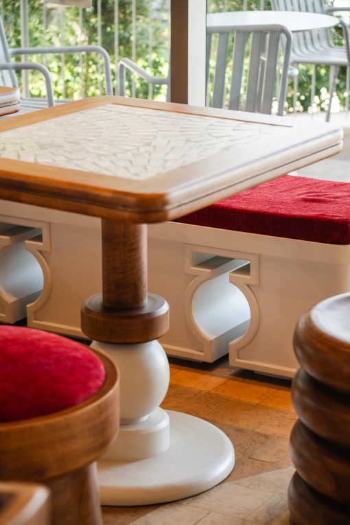 Furniture selection also emphasizes craftsmanship and draws inspiration from local artisanal traditions. For example, tabletops are finished with mosaic tiles arranged into decorative patterns, while the table legs are inspired by the forms of traditional antique beads an expression of local handcrafted heritage.