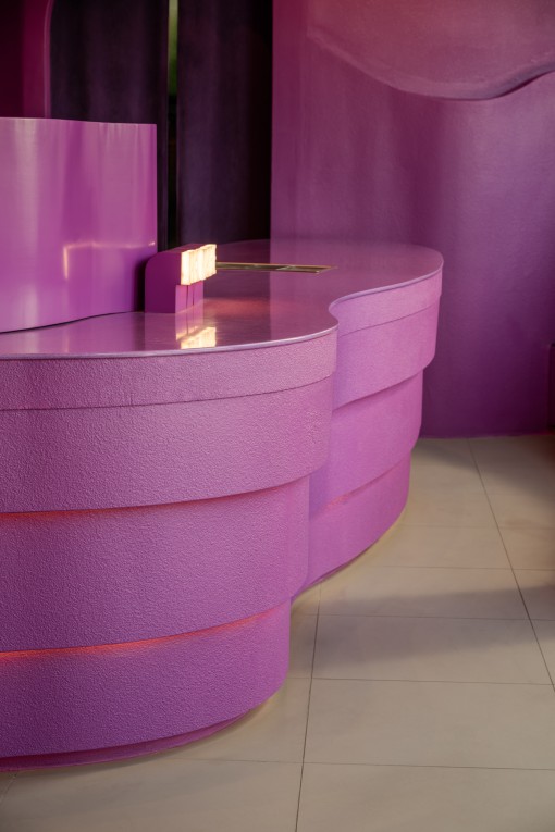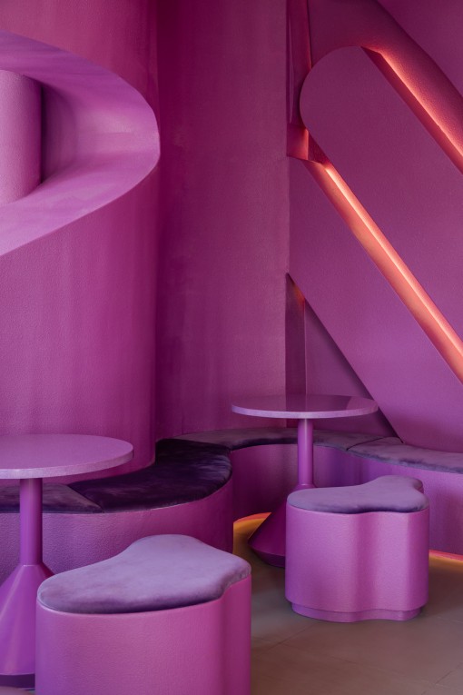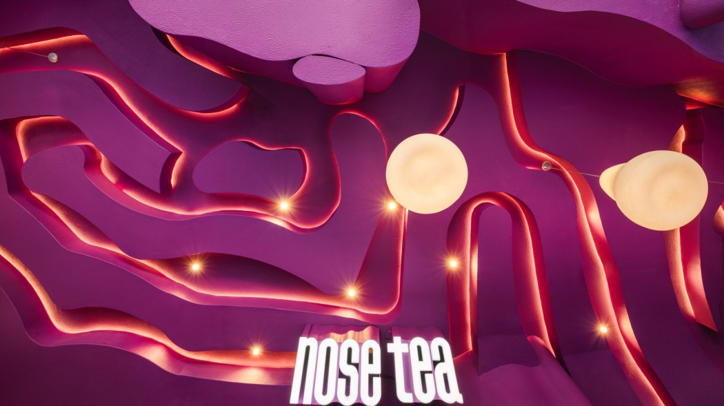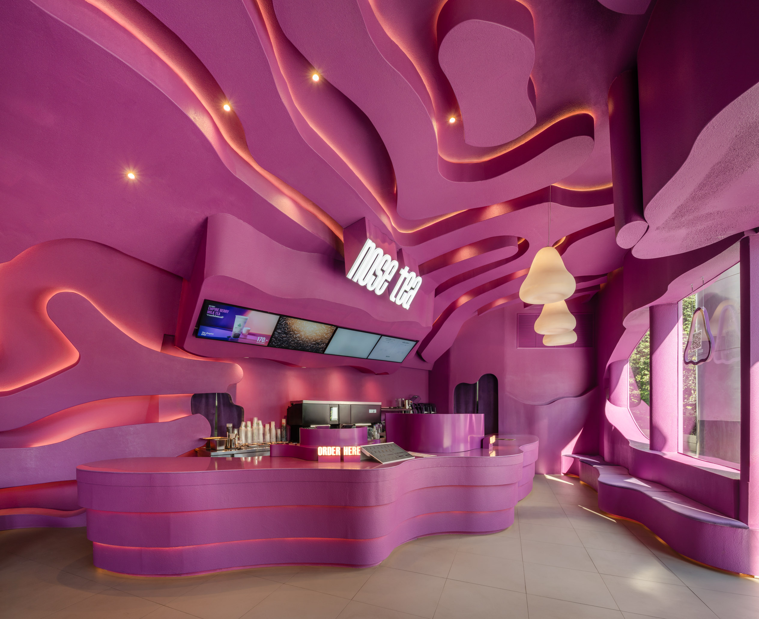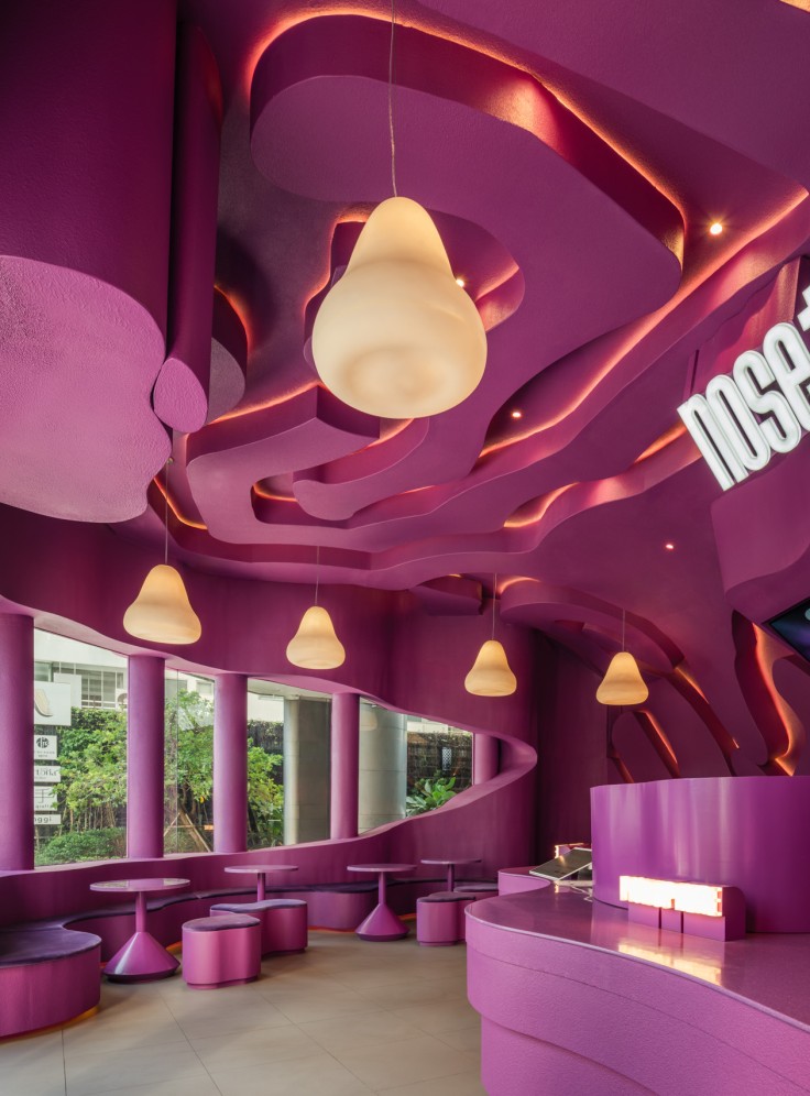 Hidden lighting within the maze enhances the glowing, emphasizes the meandering form. Bar counter, perimeter seating, and even the stool seating are all carved from the same maze structure as the ceiling, allowing every element within the space to feel seamlessly connected, as one unified design language. The rough-textured finish used on both exterior and interior walls and ceilings, consistent throughout the entire store and expressed in a single shade of magenta .This Nose Tea branch still distinctive and memorable. Remaining to surprise and excite visitors every time they step inside