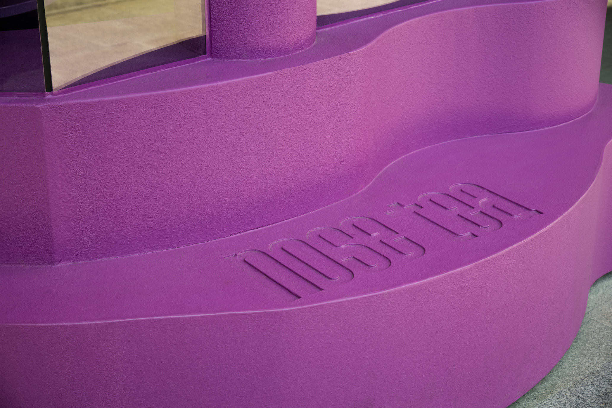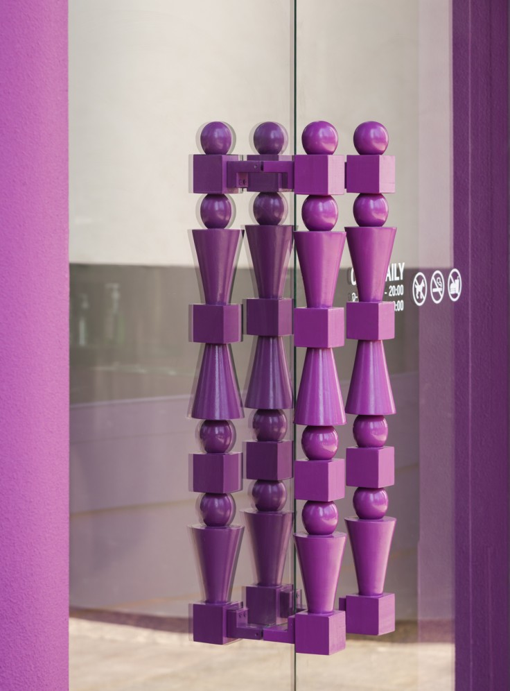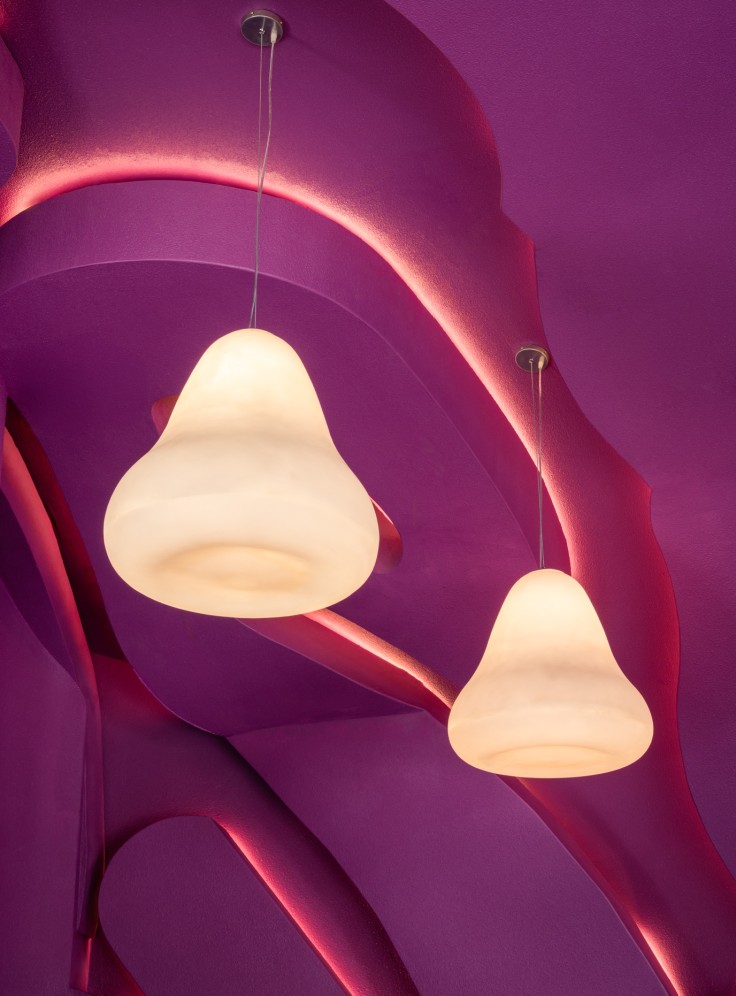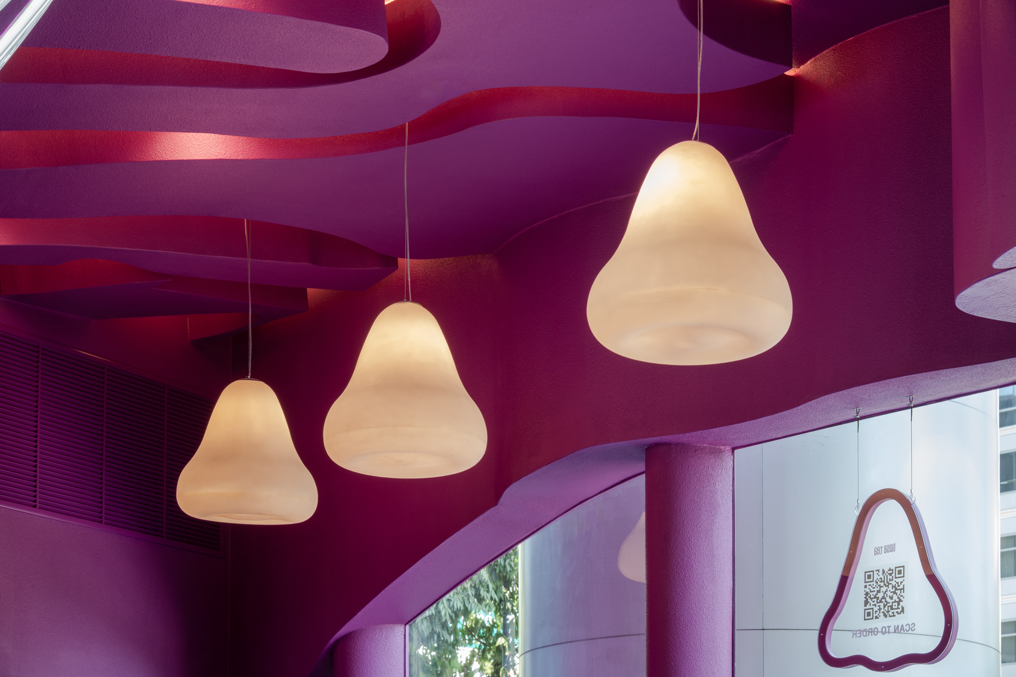 Hidden lighting within the maze enhances the glowing, emphasizes the meandering form. Bar counter, perimeter seating, and even the stool seating are all carved from the same maze structure as the ceiling, allowing every element within the space to feel seamlessly connected, as one unified design language. The rough-textured finish used on both exterior and interior walls and ceilings, consistent throughout the entire store and expressed in a single shade of magenta .This Nose Tea branch still distinctive and memorable. Remaining to surprise and excite visitors every time they step inside