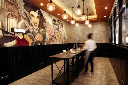 Syn-Lab is the café located in Rama 3 district, the owner is Synova who created their own food and beverage recipes. The designer team was interested in the various food recipes which are explored by our client company. We realized that the process of invention is full of trials and errors in practical. This leaded to the concept design that we called expect hard and explore harder. It is about keep doing research until getting the best result. In interior design aspect, we do have an opinion that the experiment of putting together new materials is worth trying. Sometimes the conclusion is not the same as expectation. In addition, we also try to gather different elements from client laboratory. As a result, the designs is the combination of café and laboratory. Flasks are used as a lamps in the front bar randomly to create lively atmosphere and draw customer’s attention. Due to the needs that we want to make the shop outstanding with its own key visual, we decide the bring the sense of New Yorker and their unique lifestyle in neatness but tactics. Fonts and graphics are created by following the theme of interior design on menu boards and quotes on the wall. Moreover, at the back of the café is designed with glasshouse to make the space clearer and brighter than other parts. This part is a persuaded area, inviting people to come inside. Right behind this space, the door is concealed between windows, workshop room is installed. Inside the workshops, there is a graphic hand painting along the wall by Thai artist called Mamablues. Dr. Syn and lady pastry, her assistant, are created to tell a story of Synova while developing new ingredients and recipes. For these reasons, Synlab becomes not only a café but also laboratory where telling stories behind the scene of Synova in every single meter completely and clearly. These are the charming character of space where inspired people who enjoy eating and go round. Don’t miss it, aim the point and mark on this location, Synlab.